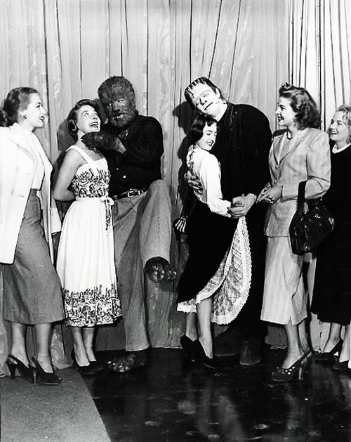 Glenn Strange and Lon Chaney, Jr. find a couple of girls to dance with during the production of “Abbott and Costello Meet Frankenstein” (1948)