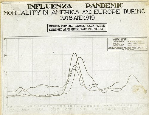 Reeve 003143 Chart: Sanitation. Influenza pandemic. Mortality in America and Europe 1918 and 1919. 08/20/1919. [Diseases.] World War 1