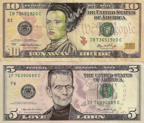 Pretty clever crafted money that has your favorite movie monsters. Hmm, I wonder if a $100 Dracula bill can cover dinner for me and my family? Blood money now takes on a new meaning. ha.