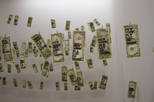 New York is a lot of work. is an edition of 1,000 real dollar bills emblazoned with a maxim, “New York is a lot of work.” The text is hand-imprinted with a high-gloss foil stamp.”
