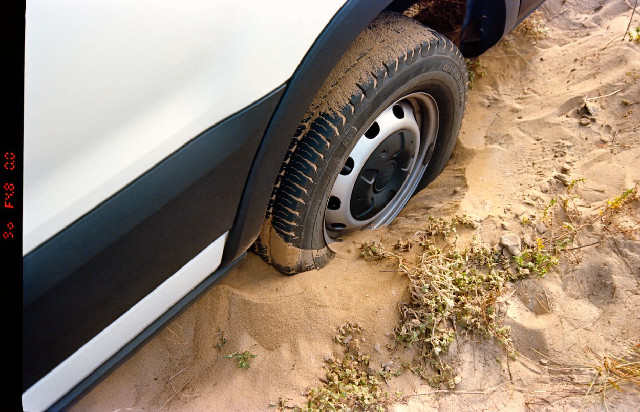 A huge Grinch stuffed doll next to a large porcelain Santa Clause with a class car parked on a neighborhood street corner. No gifts, overgrown trees, two cones but not the same style or size.