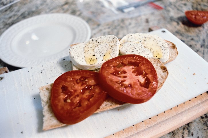 I cut my homemade bread in half and topped it with olive oil, mozzarella, and vine-ripened tomatoes. A sprinkle of salt and pepper added the final touch.