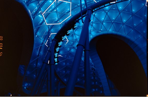 As the coaster passes by, hexagon-shaped lights turn on the surface. It's cool to watch.