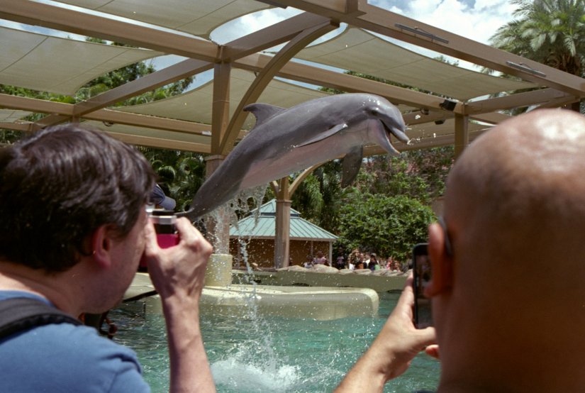 I was at Seaworld and had my Voigtlander 40mm manual focus lens on my Nikon F80. I keep my lens focused to infinity; Zone Focus, BABY! I happen to glance up and I saw a dolphin in the air. I quickly raised my camera. As I was raising my camera I focused closer, maybe to 10 feet and took the shot. It was quick and I wasn't even really sure what I got. It was all muscle memory. I asked myself; was the dolphin still in the air?