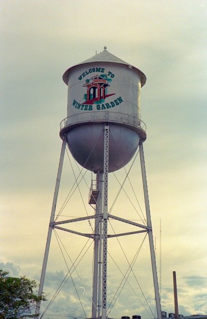 Winter Garden water tower by the railroad museum and parking garage.
