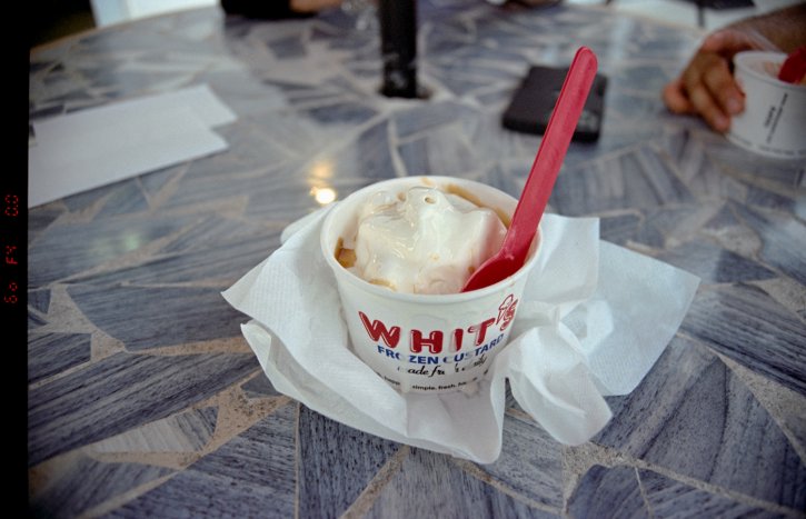 Whit's Frozen Custard. Vanilla with hot caramel. Nikon F80s, Kodak Vision3 250D.