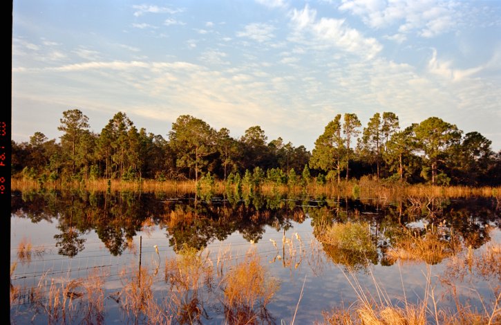 Overflowed lake with wonderfully lit pine trees in the background. Kodak Ektar 100.