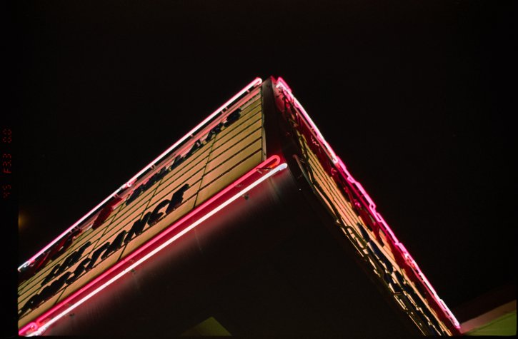 Movie theater neon sign at night shot on Kodak Vision3 250D.