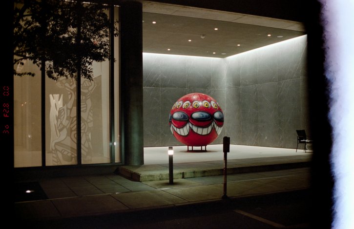 Huge ball with faces sculpture by Kenny Scharf in Coconut Grove Florida.