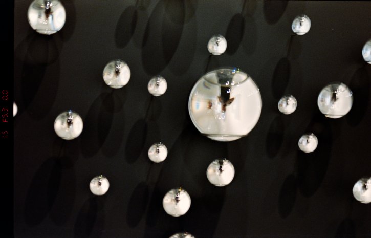 My reflection on multiple bubbles. Kodak Vision3 250D -1.0EV on the Nikon F80s with the Nikkor 28–80mm f/3.3–5.6 G lens.
