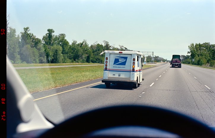 USPS mail van driving real fast on the highway. Kodak Ektar 100 film, Nikon F6 with the Nikon 50mm f/1.8 D lens.