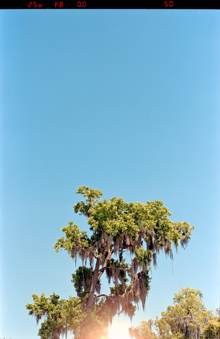 Spanish moss hanging from a toll tree with a lens flare/ light leak on Kodak Ektar 100 film.