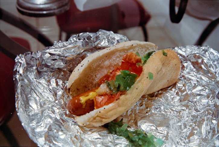 Chicago dog wrapped in aluminum foil half eaten. Kodak Vision3 250D.
