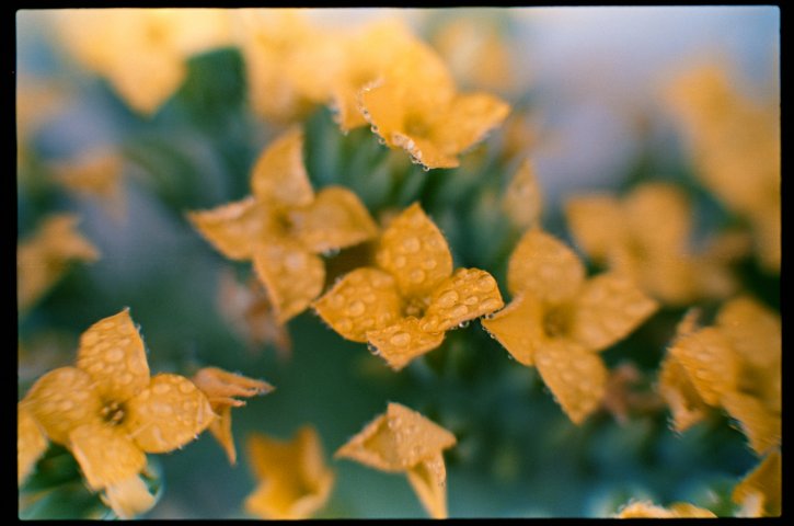 Yellow peddle flowers with rain drops. Kodak Vision3 250D movie film.