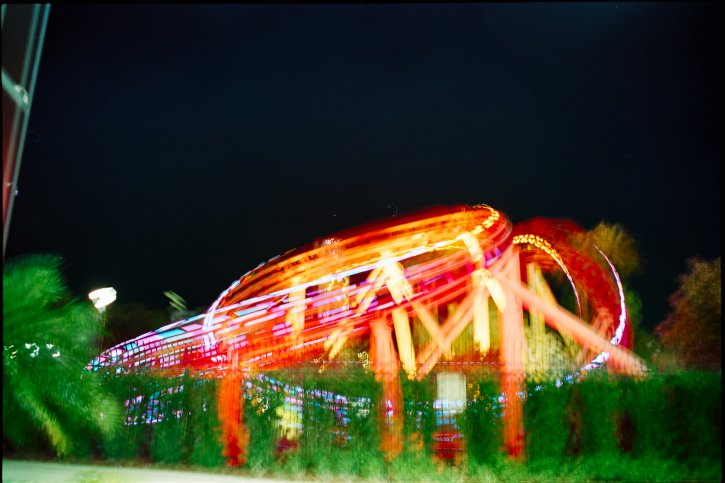Handheld long exposure spinning light trails on Kodak Vision3 250D movie film as still photography.