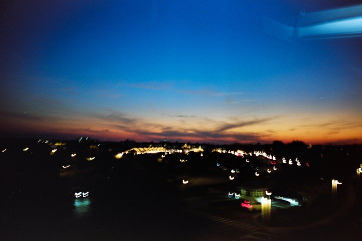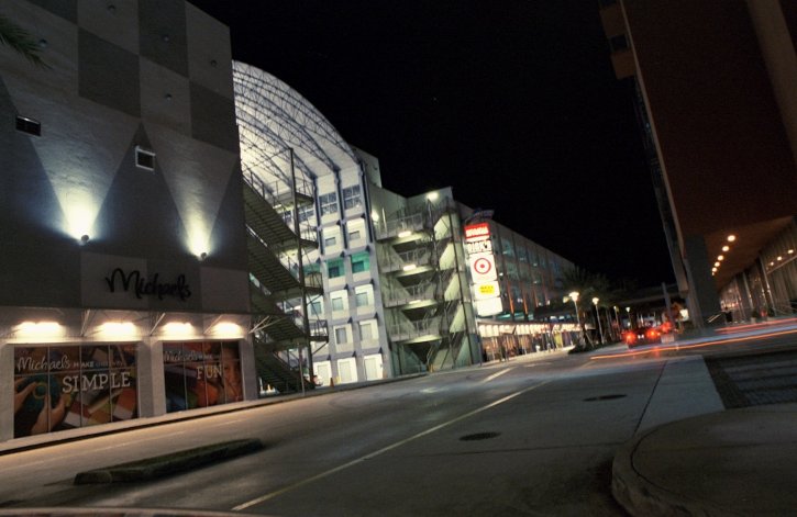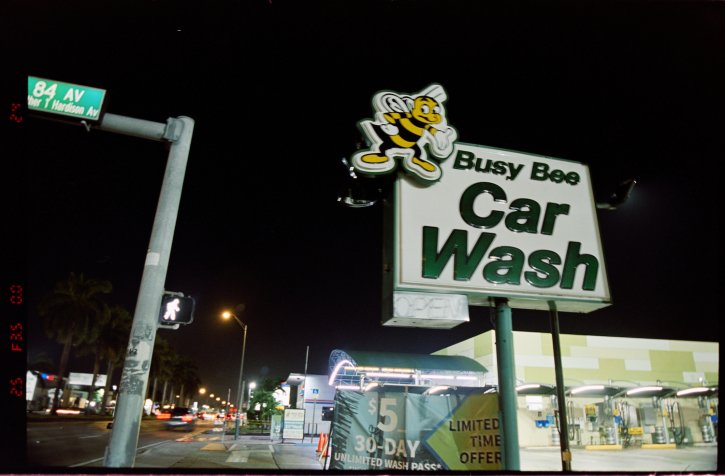 Busy Bee Car Wash Bird Road Miami at night on movie film, Kodak Vision3 250D.
