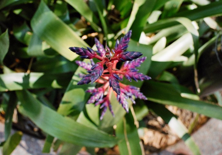 Weird plant with a weird purple reddish flower on Kodak Vision3 film stock.