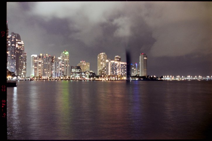 Night time view of the water around Brickell Key from Brickell Bay Drive. Shotonfilm. Kodak Vision3 250D movie film as still photography.