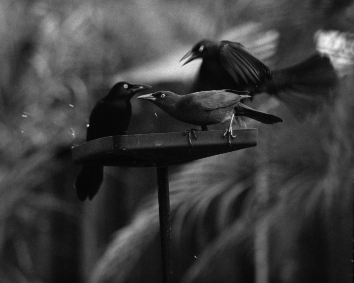 Black birds fighting on a birdfeeder on the classic Kodak Tri-X 400 film.