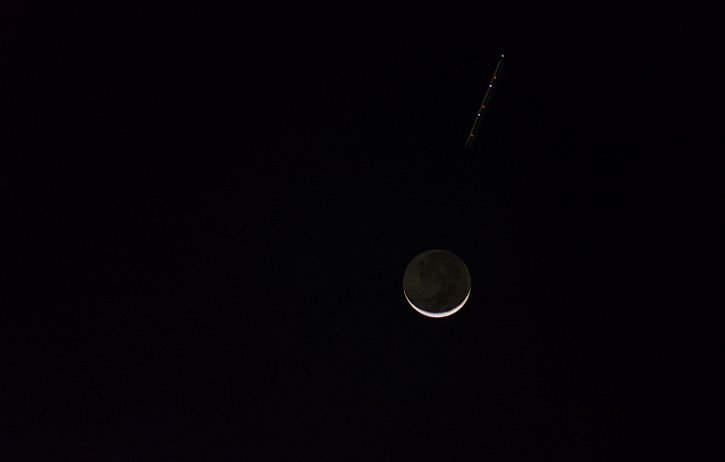 Long exposure of the moon with a planes Anti-collision lights blinking.