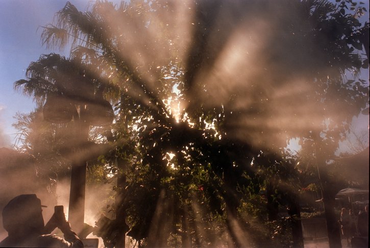 Foggy Sunlight beams through the tree leaves. Kodak Vision3 250D film.