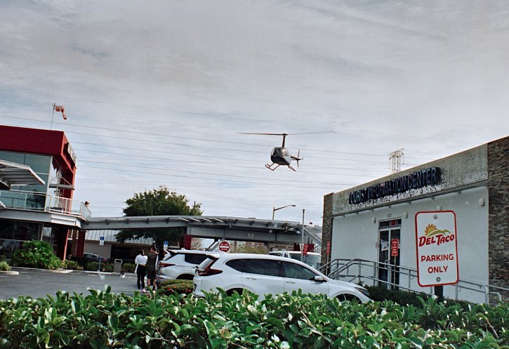 Helicopter taking off and flying away from the Del Taco parking lot. Kodak Vision3 250D film.