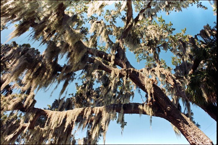 Spanish moss hanging from an oak tree on Kodak Vision3 250D cinema film as still photography.