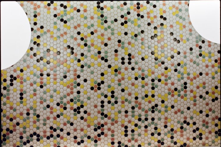 Kodak Vision3 250D photo of round tiles that look like marbles. Nikon FM2n, 28mm f/2.8 E series lens.
