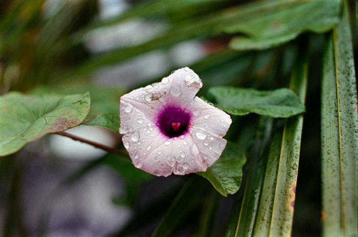Water drops on a light purple flower with a dark purple center. Kodak Vision3 250D movie film as still photography shot on the Nikon FM2n with the Voigtlander Ultron 40mm f/2 SLII lens.