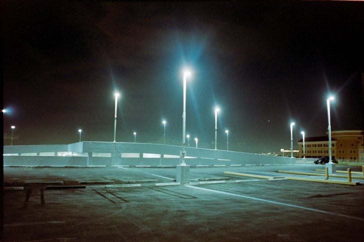Roof of an empty parking garage at night. Kodak Vision3 250D on the Nikon Fm2n with the Nikon 28mm f/2.8 Series E lens.