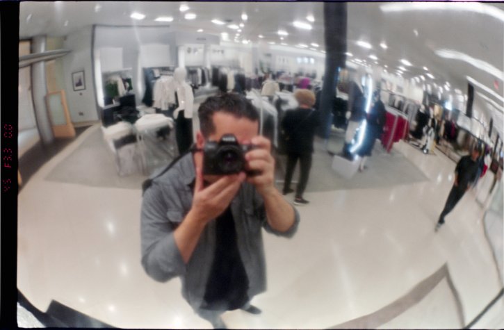 I captured a cool picture by aiming my camera at a huge shiny Christmas ornament. It was at the mall and bigger than a beach ball. Looks like a fisheye but it was on a 50mm lens.