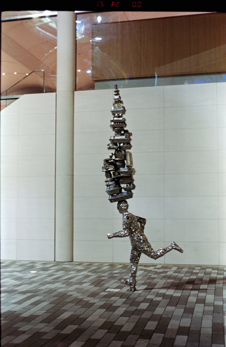 Constantin Brancusi gold sculpture in the Chicago Art Institute. vs. Tom Friedman takeaway running man sculpture at Aventura Mall Miami, Florida.