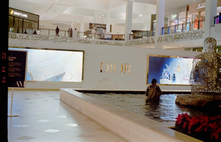 Man cleaning fountain pool in front of fancy gold Dior popup store.
