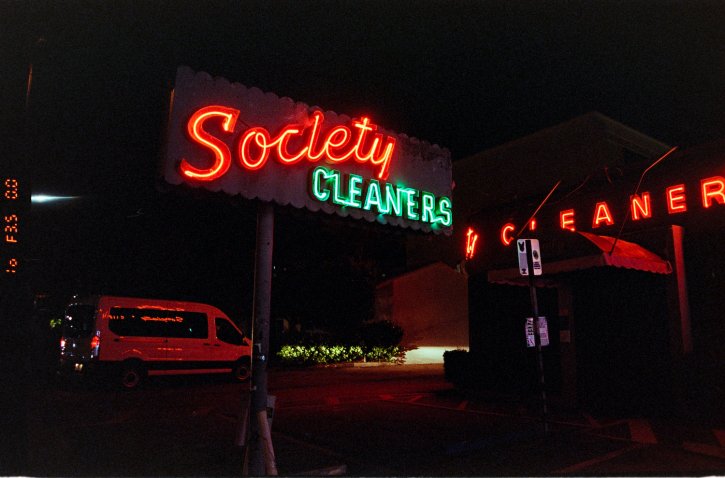 Society Cleaners Neon Sign on Kodak Portra 400 film.