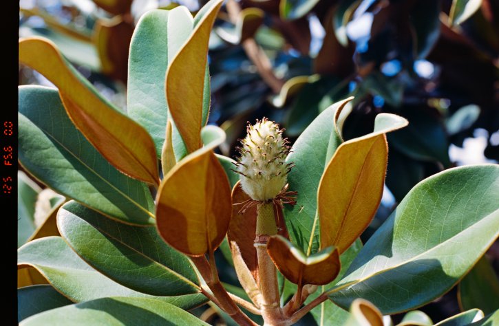Unbloomed Southern magnolia flower on Kodak Ektar 100 film shot on the Nikon F80s with the Nikkor 50mm f/1.8D lens.
