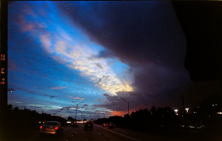 Dark storm clouds cover half the sky as the last streaks of sun light hits the blue sky as the sun sets. Captured on film, Kodak Portra 400 on the Nikon F80s with the Voigtlander Ultron 40mm f/2 lens.