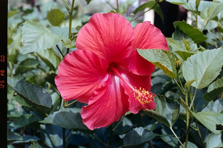 Sharp a colorful photo of a big red hibiscus rosa flower on Kodak Ektar 100 film shot on Nikon F80s with the 50mm f1/8 lens.