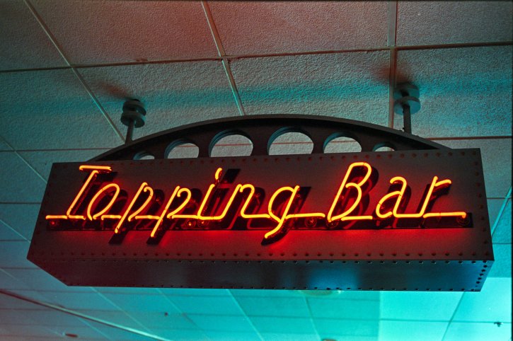 Toppings neon sign at Magic Kingdom. Nikon FM2n on Kodak Vision3 250D film.