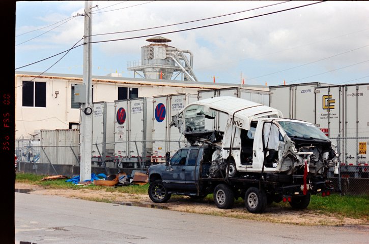 Find a way to get it done, pickup truck with two small work vans attached to it. SHot on Kodak Vision3 250D cine film shot as still photography.