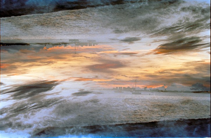 Sun setting sky and ocean with buildings in the background double exposure on Kodak 250D film.