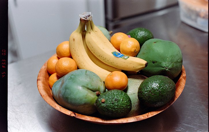 Sample fruit bowl photo on Kodak Vision3 250D 5207 cinema film as still photography. Shot on the Nikon F80s with the Nikon 50mm f/1.8 D lens.