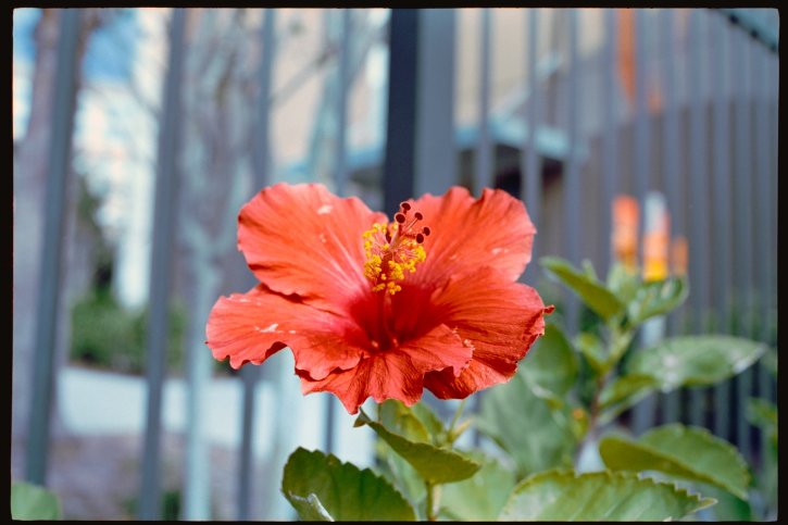 Hibiscus flower on Kodak Vision3 250D ( 5207 ) movie film as a still photo.