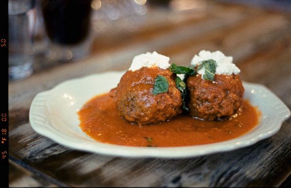 Pizza Craft (Ft Lauderdale) Meatballs with marinara sauce and ricotta cheese on top. Kodak Gold 200 on the Nikon F6 film camera. Hmmm, looks delicious.