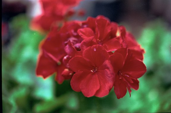 Red flowers on Kodak Vision3 250D movie film shot as still photography. Nikon FM2n camera with the Voigtlander Ultron 40mm f/2 SLIIS lens.