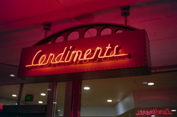 Neon sign at Magic Kingdom Condiments. Nikon FM2n on Kodak Vision3 250D film.