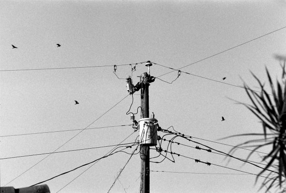 Power lines utility pole with birds flying by. Shot on the Nikon FMn2 film camera with Kodak Tri-X 400 film.