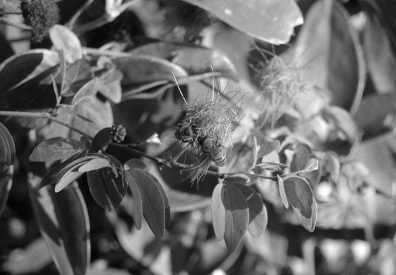 Black and white photo of two bees on a red flower shot on Kodak Tri-X 400 film. Nikon F6.