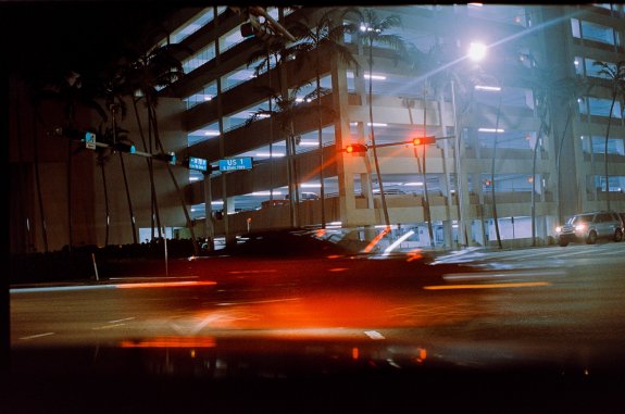 Sunset Place parking lot in the background, traffic light Long exposure of the intersection with a car passing. South Miami on film.