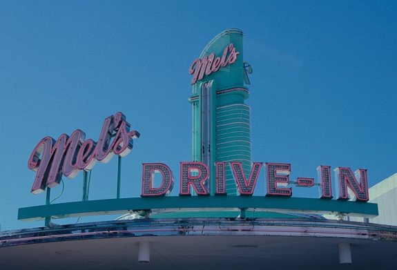 Mel's neon sign during the day, DRIVE-IN. Nikon F80. Orlando Florida