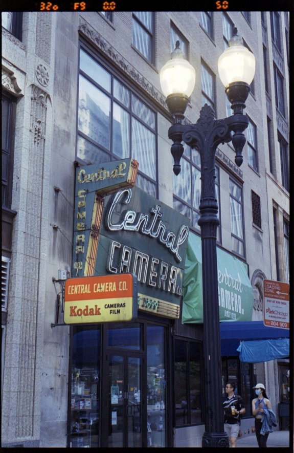 Central Camera Chicago storefront closed on a Sunday. Kodak Portra 800 on the Nikon F6 with the Nikkor 50mm f/1.8 D lens. Kodak store sign on film.